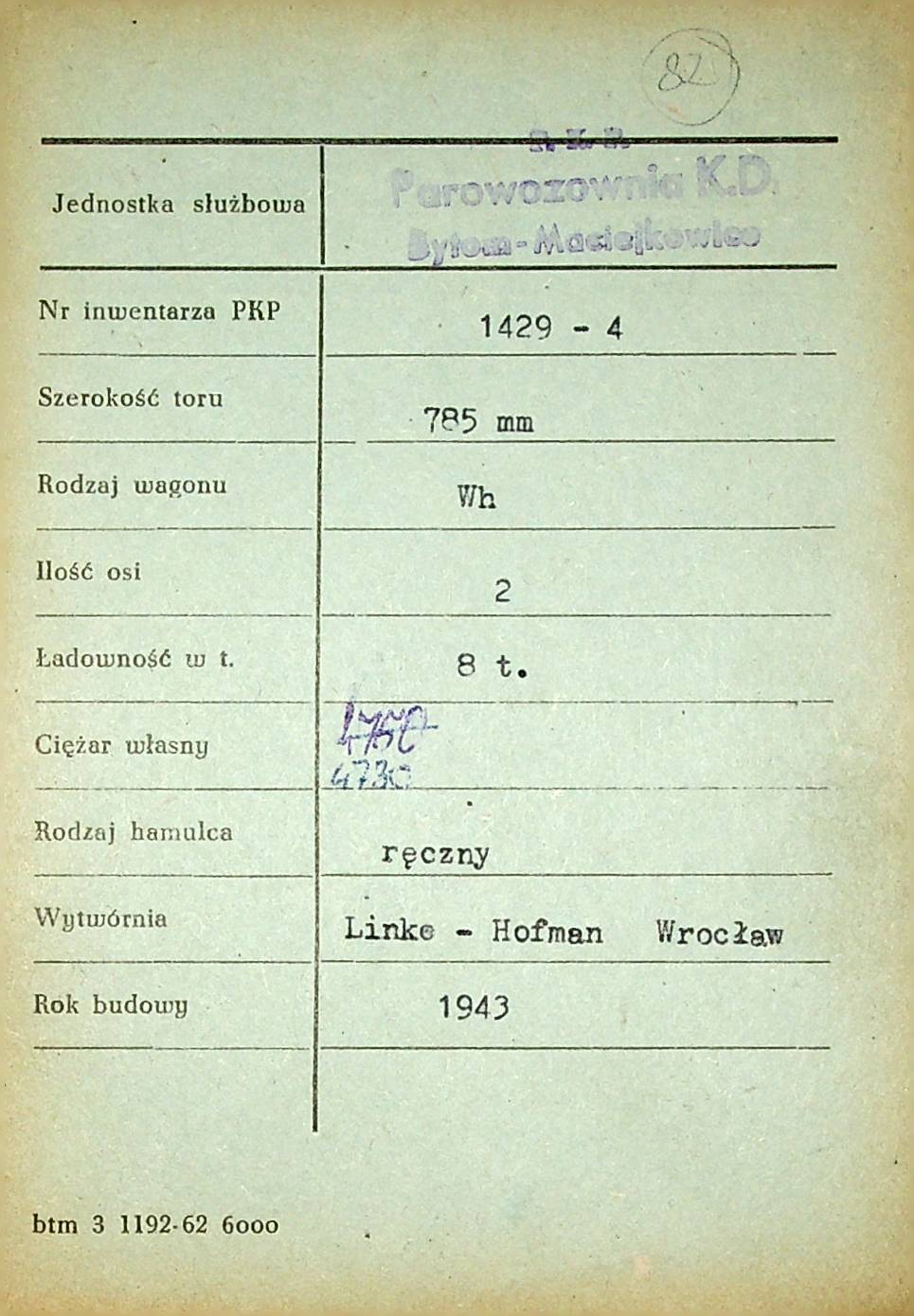 Karta wagonu Górnośląskich Kolei Wąskotorowych |