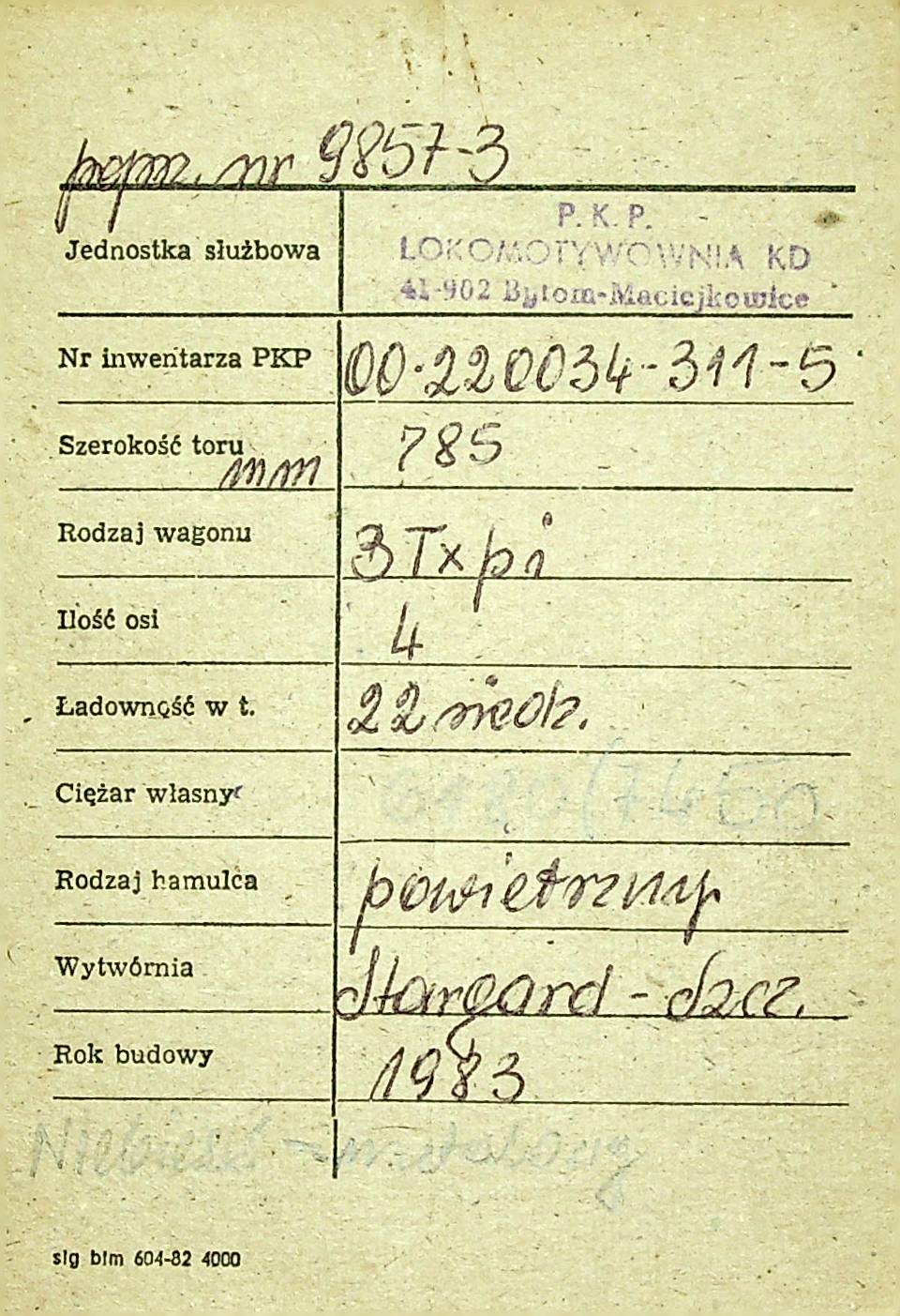 Karta wagonu Górnośląskich Kolei Wąskotorowych |