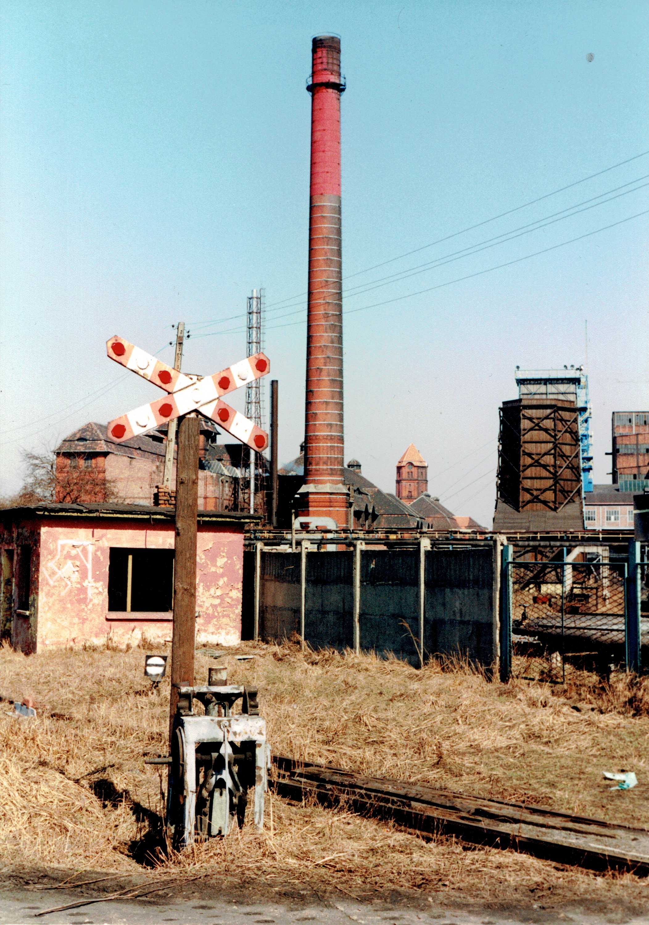Zabudowania Kopalni Węgla Kamiennego "Gliwice". Na pierwszym planie - odgałęzienie wąskotorowej bocznicy KWK "Gliwice" od linii Gliwice Trynek - Rudy Raciborskie (formalnie: Bytom Karb Wąsk - Markowice Raciborskie Wąsk). Widoczne resztki rogatek osłaniających przejazd przez ul. Bojkowską w Gliwicach. Zdjęcie wykonano w drugiej połowie lat 90. XX wieku.