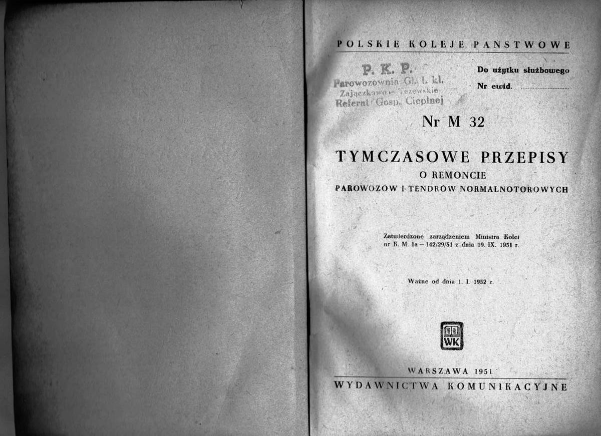 M 32 - Tymczasowe przepisy o remoncie parowozów i tendrów normalnotorowych zatwierdzone zarządzeniem Ministra Kolei nr K. M. 1a - 142/29/1951 z dnia 19.IX.1951.