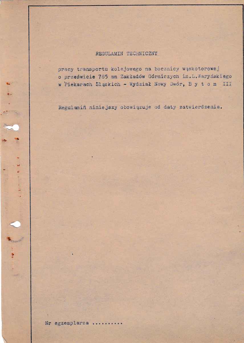 | Tytuł | Regulamin techniczny ruchu kolejowego na bocznicy wąskotorowej ZG im. L. Waryńskiego w Piekarach Śląskich - Wydział Nowy Dwór, Bytom III | ||