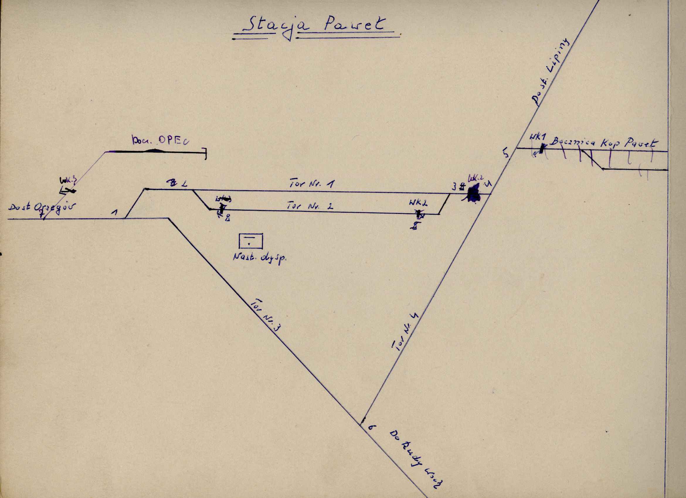 Schemat stacji Paweł Górnośląskich Kolei Wąskotorowych znaleziony pośród dokumentacji kolejowej na jednej ze stacji GKW. Data, autor oraz cel jego wykonania nie są znane. Skala najprawdopodobniej nie jest zachowana, oddano jednak wiernie układ torów oraz urządzeń SRK. Materiał pochodzi ze zbiorów Mariusza Senderowskiego.