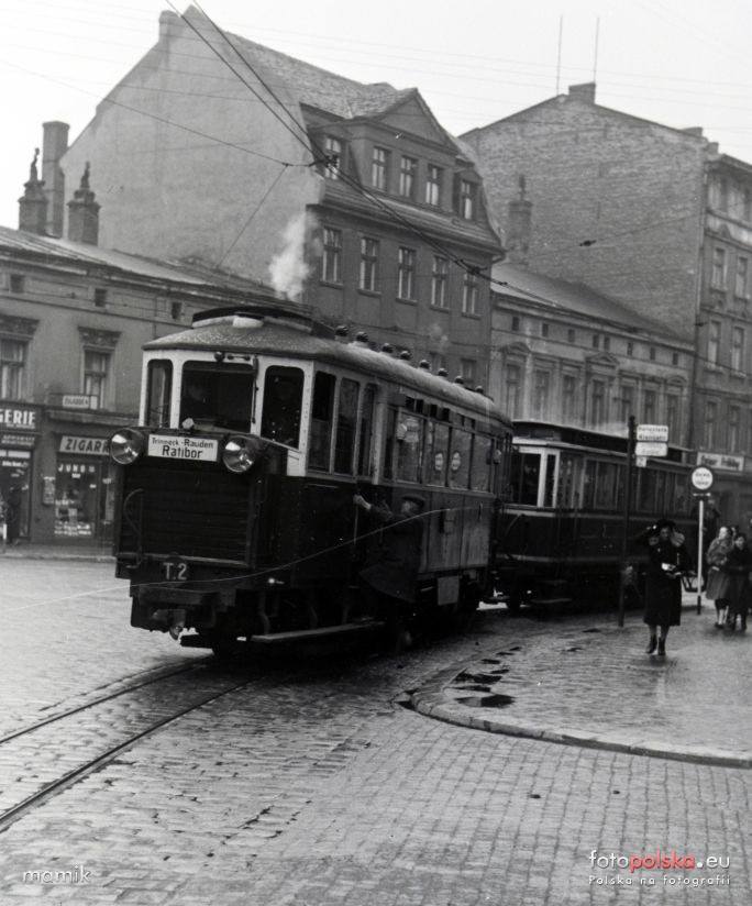 Wagon motorowy T2 (prod. Dessauer Waggonfabrik A.G., 1926) na czele pociągu do Raciborza. Zdjęcie wykonano na rogu dzisiejszych ulic Dunikowskiego i Mikołowskiej.