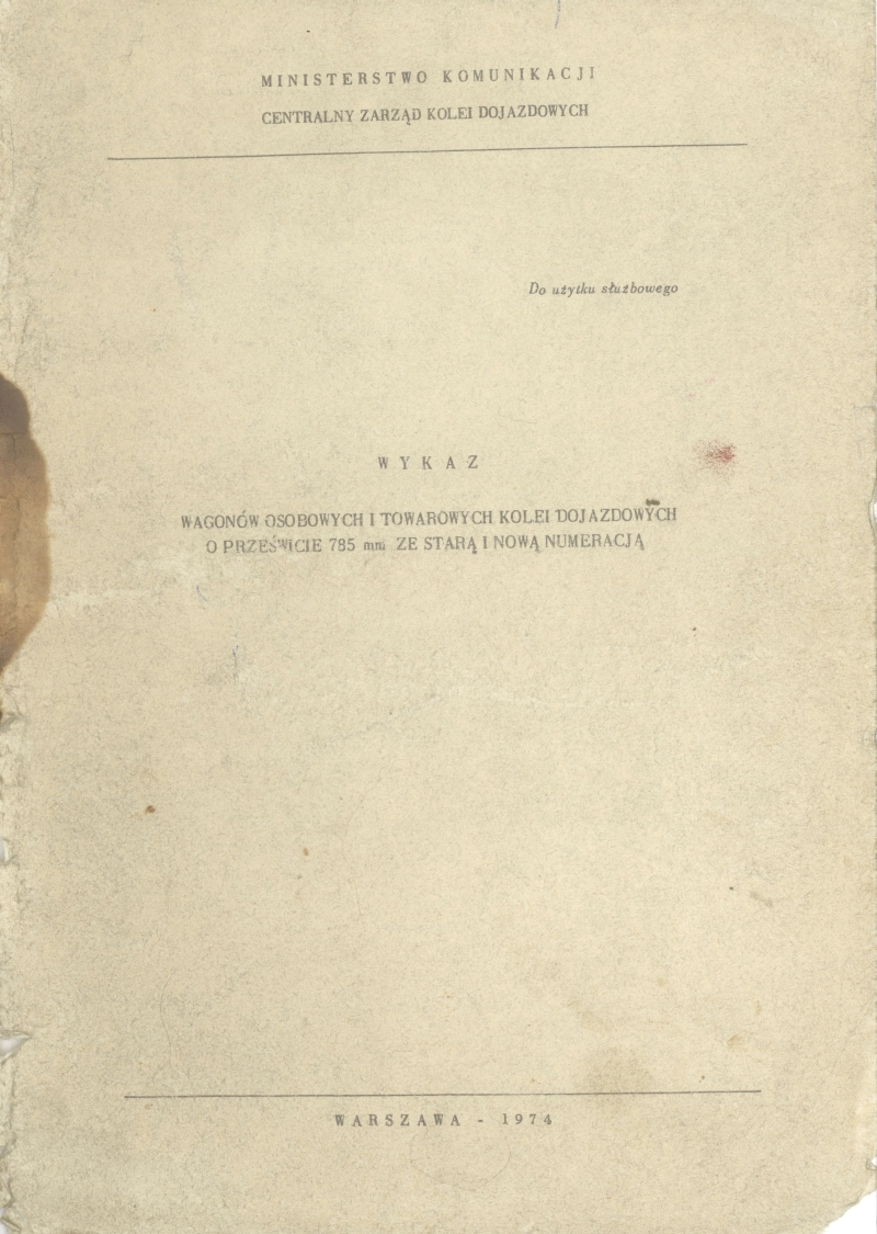 Wykaz wagonów osobowych i towarowych kolei dojazdowych o prześwicie 785 mm ze starą i nową numeracją. Okładka I