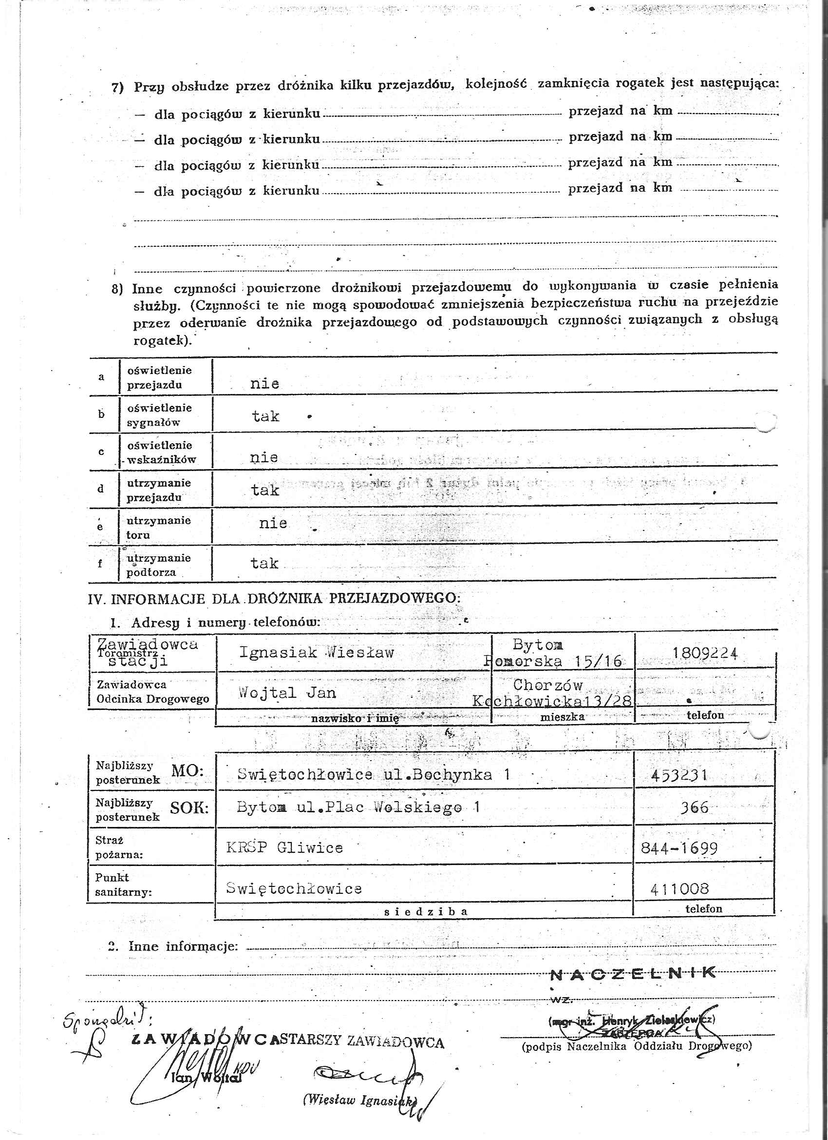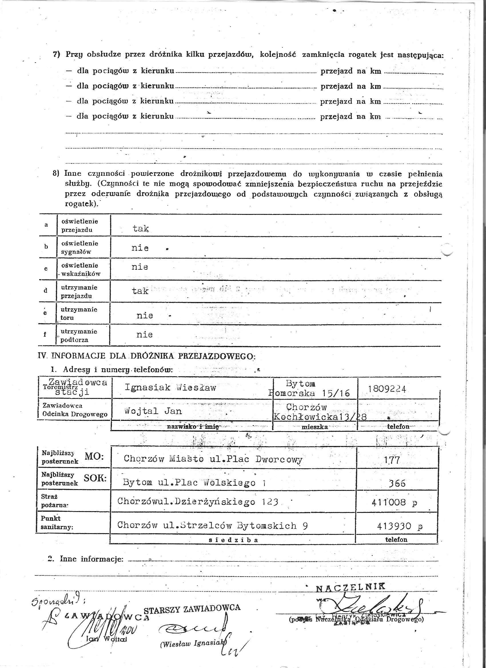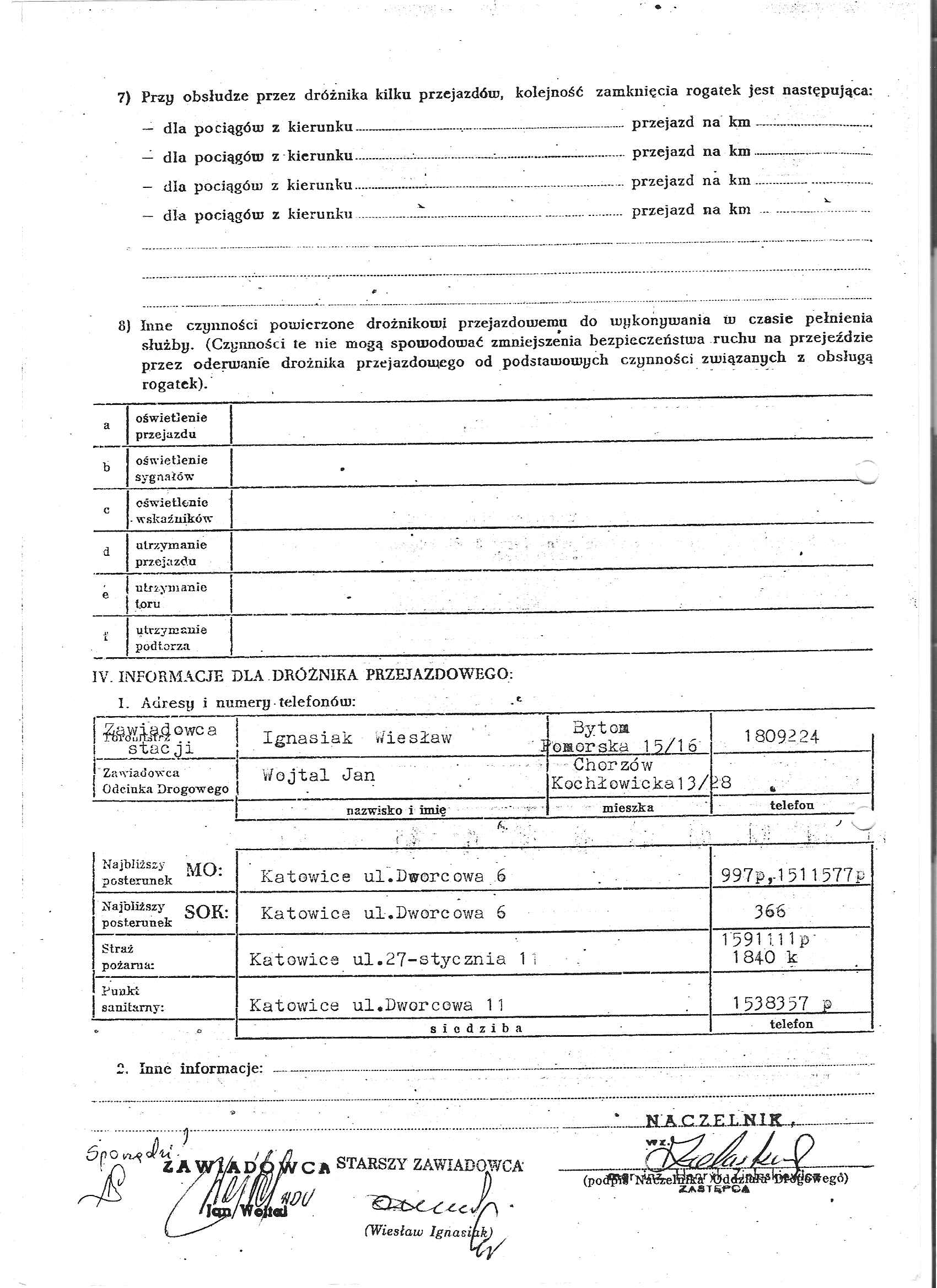| 22:15, 24 mar 2013 | Oswiecimska2.jpg (plik) | 291 KB | Paweł Niemczuk | Regulamin obsługi przejazdu kolejowego zlokalizowanego na ulicy Oświęcimskiej (Siemianowice Śląskie), linia kolejowa Sucha Góra - Katowice Szopienice. Dokładna data sporządzenia nie jest znana. Najprawdopodobniej lata dziewięćdziesiąte XX wieku | 1 | |