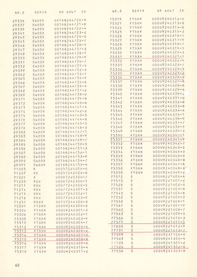 | 14:05, 20 cze 2014 | Wykaz 750mm 42.jpg (plik) | 703 KB | Jacek Fink-Finowicki | Wykaz wagonów osobowych i towarowych kolei dojazdowych o prześwicie 750 mm ze starą i nową numeracją. Strona 42 == Licencja == {{PD-symbol}} Kategoria:Archiwum:Wykaz wagonów 750 mm (1974) | 1 | |