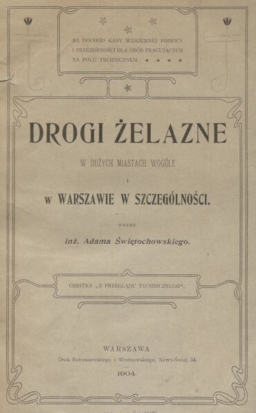 Drogi żelazne w dużych miastach wogóle i w Warszawie w szczególności – opracowane przez Adama Świętochowskiego w formie artykułów dla czasopisma "Przegląd Techniczny" i wydane w roku 1904 w postaci książkowej.