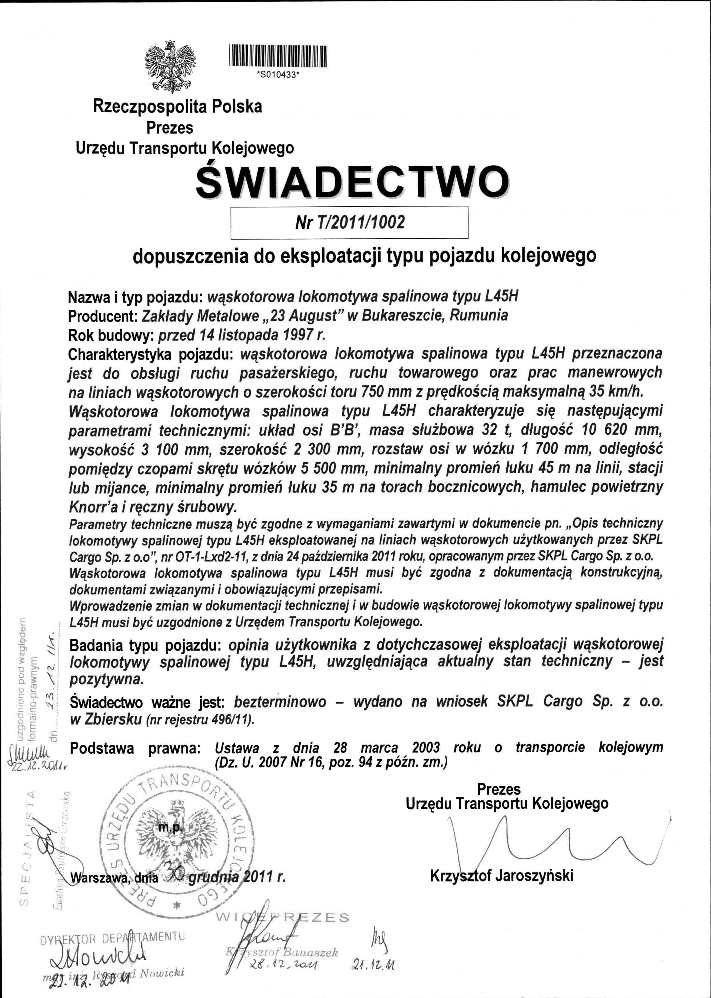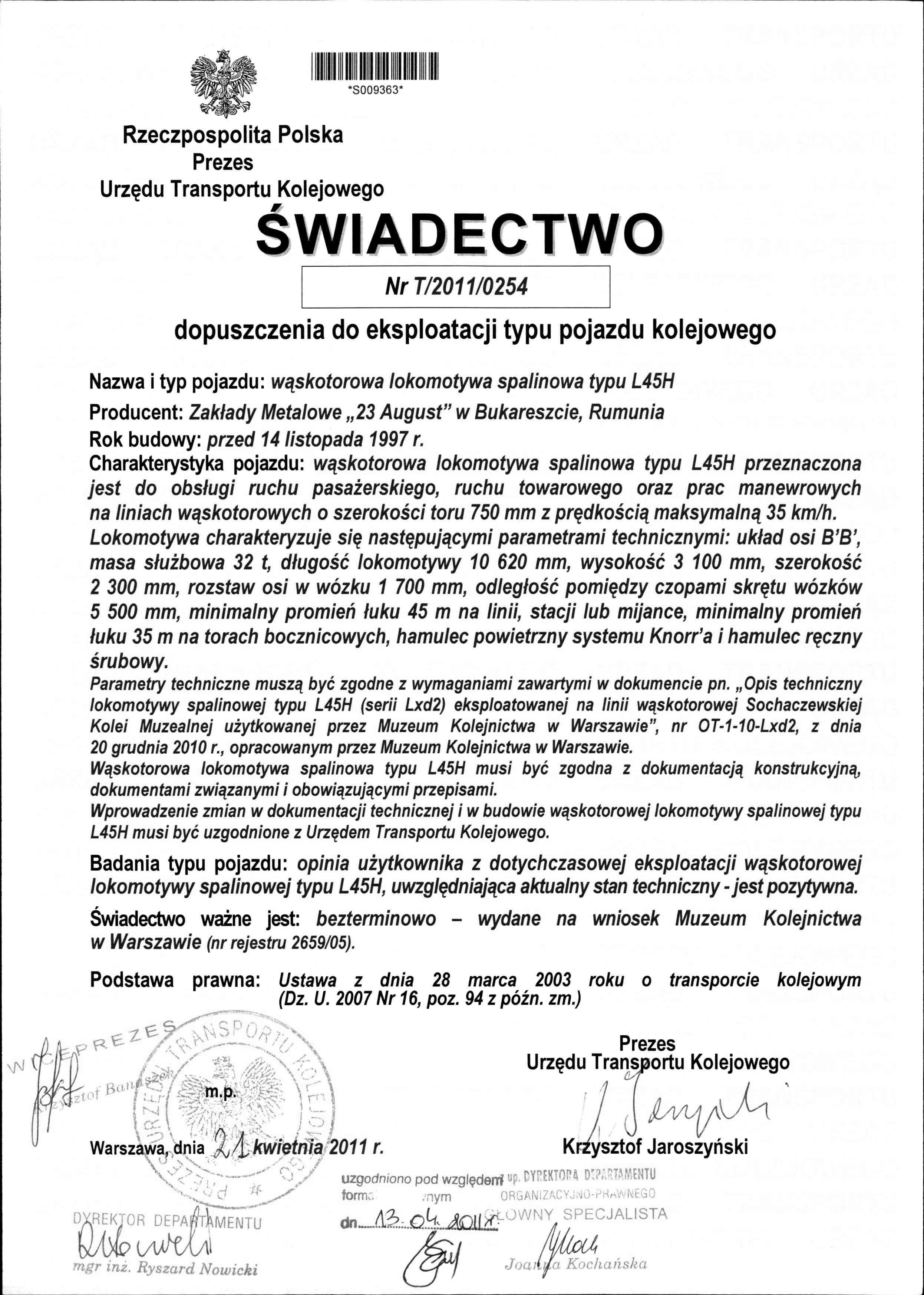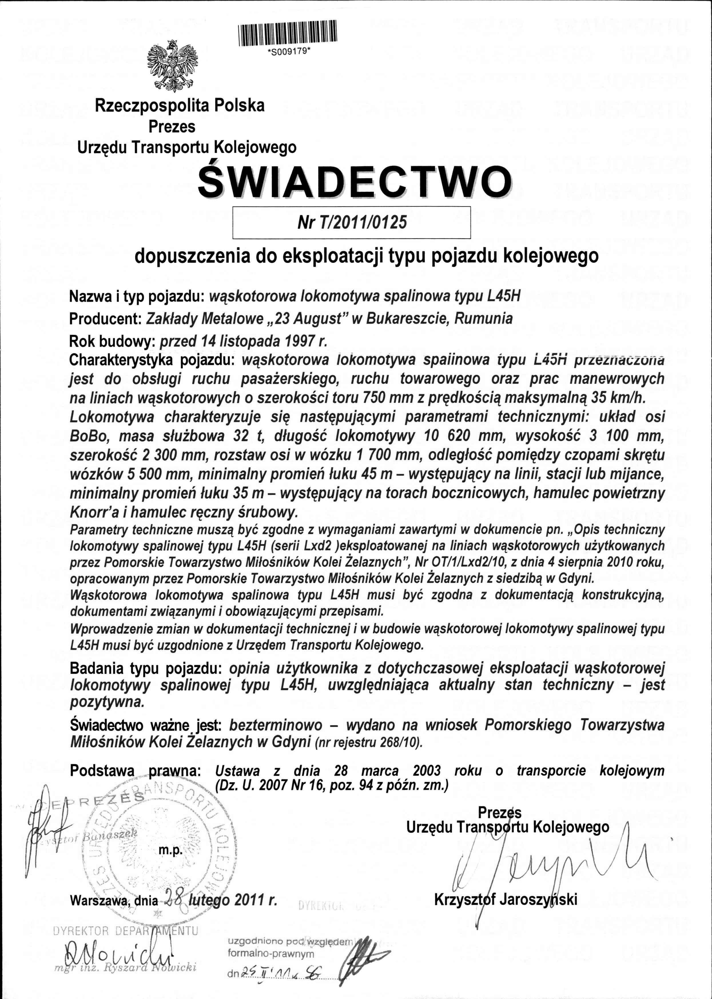 | Świadectwo typu | T/2011/0125; T/2011/0169; T/2011/0254; T/2011/0315; T/2011/0559; T/2011/0737; T/2011/0739; T/2011/0802; T/2011/1002; T/2012/0675; T/2013/0003; T/2014/0121 |