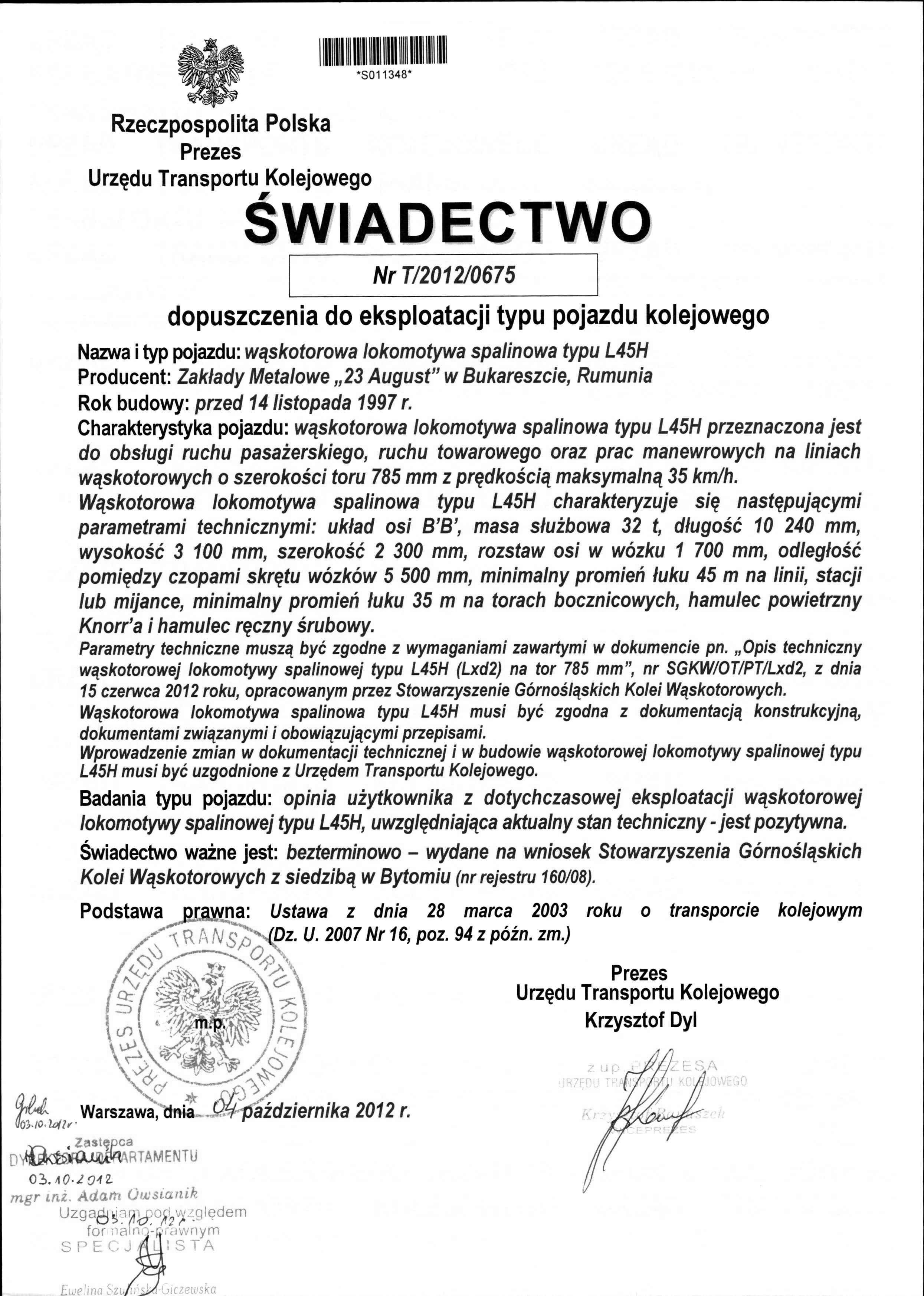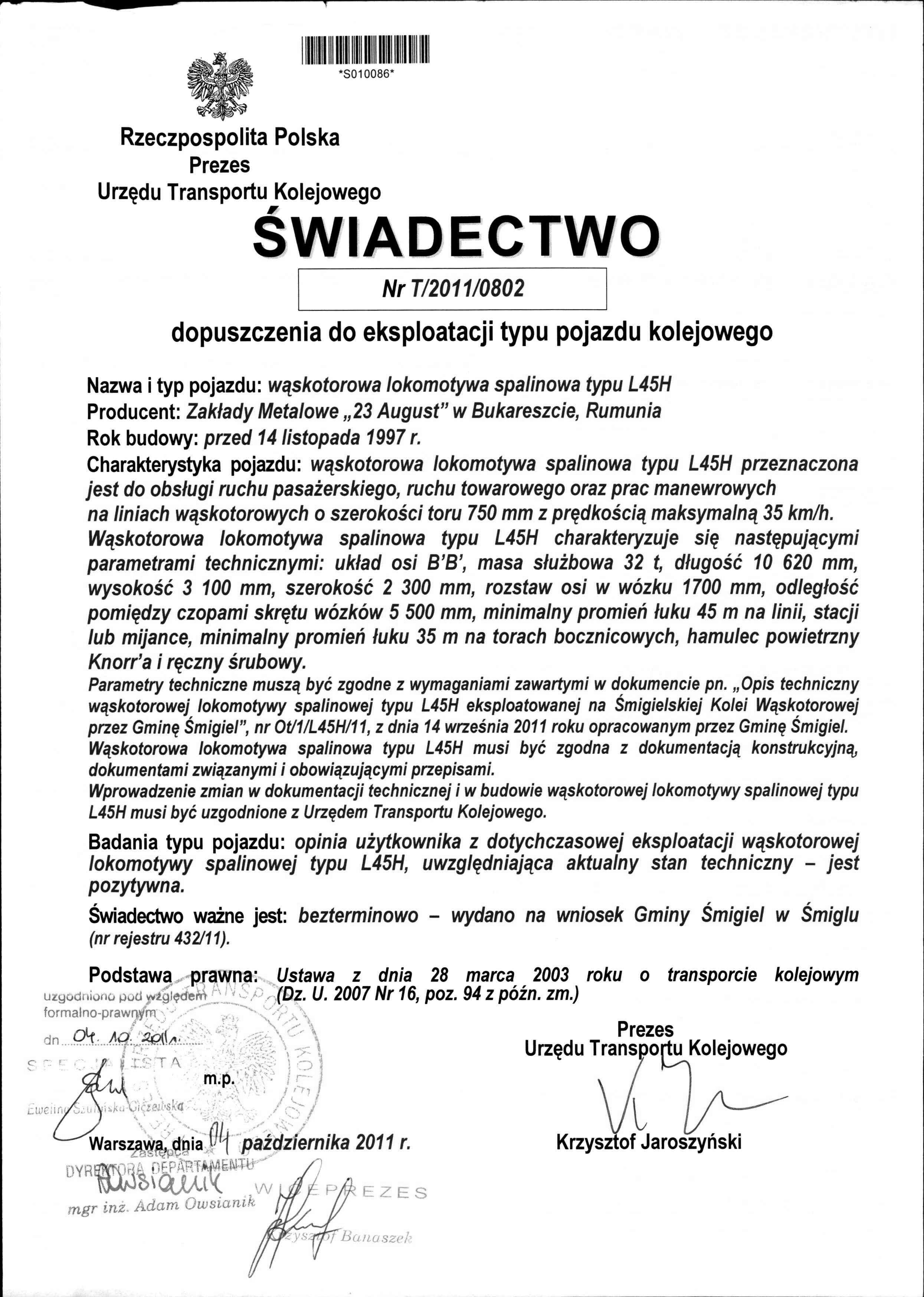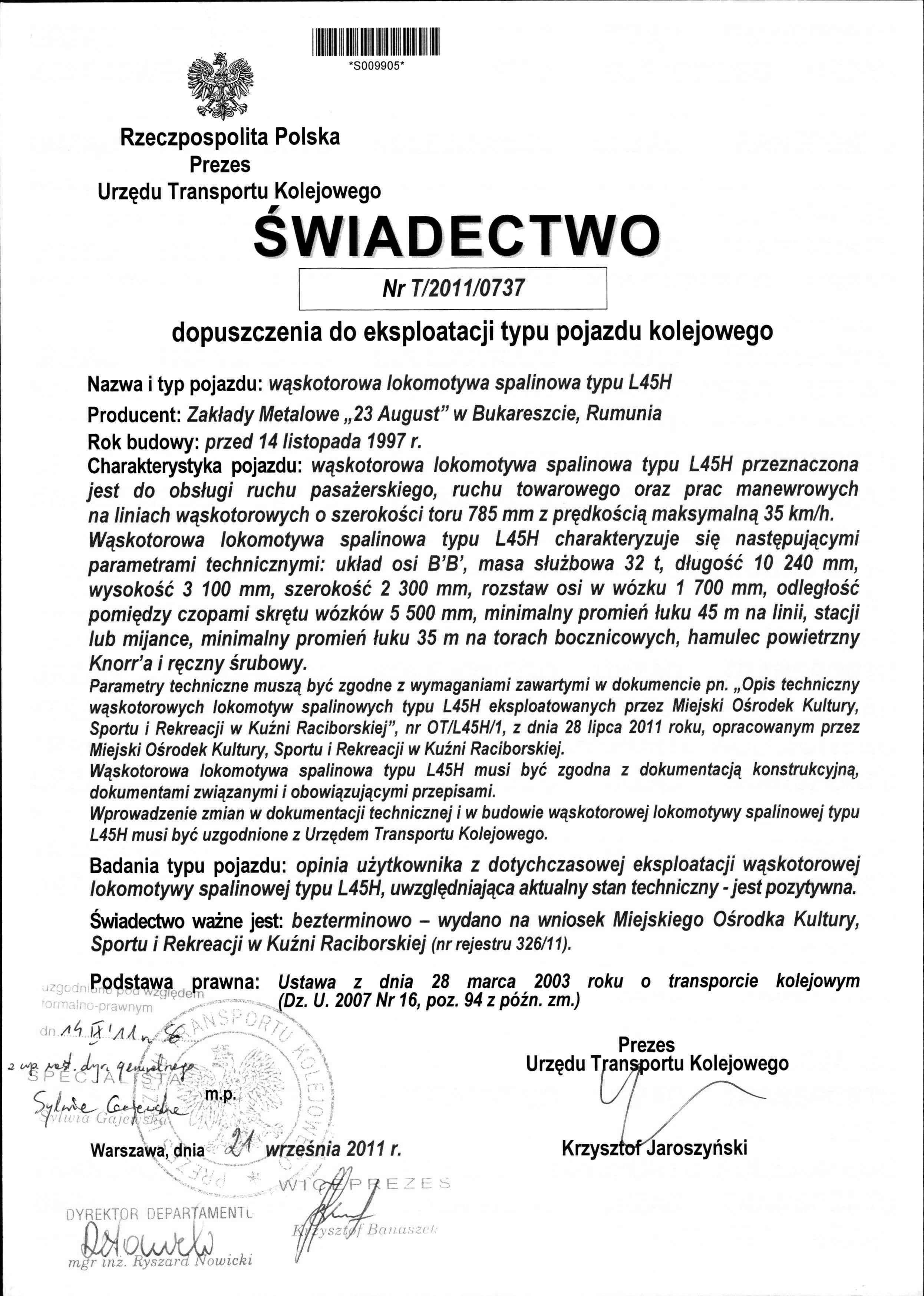 | Świadectwo typu | T/2011/0125; T/2011/0169; T/2011/0254; T/2011/0315; T/2011/0559; T/2011/0737; T/2011/0739; T/2011/0802; T/2011/1002; T/2012/0675; T/2013/0003; T/2014/0121 |